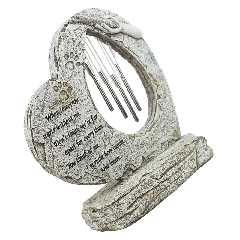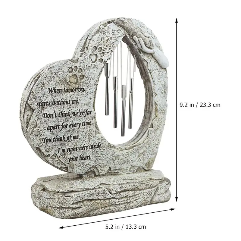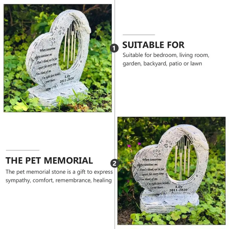 The pet memorial stone is designed into a heart shape, features with a wind chime, perfectly use it to express the memory and love for pet. This pet memorial stone can help a sad friend or lover to remember their loved furry one. Sharing good memories and emotions together.